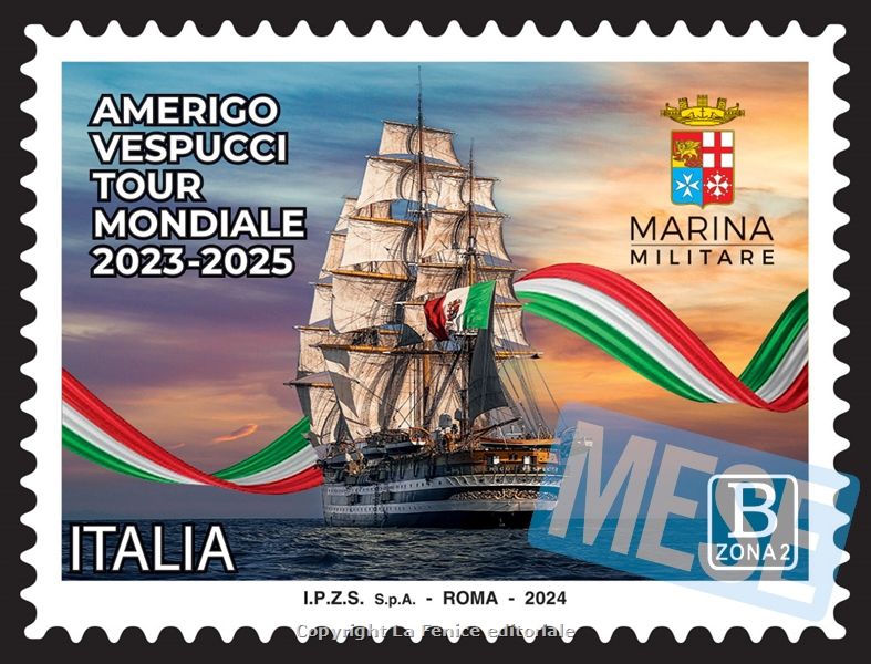 Poste Italiane comunica che oggi 7 luglio 2024 viene emesso dal Ministero delle Imprese e del Made in Italy un francobollo celebrativo dedicato al viaggio: il giro del mondo della Nave Amerigo Vespucci, relativo alla tariffa B zona 2 pari a 2,45€ .