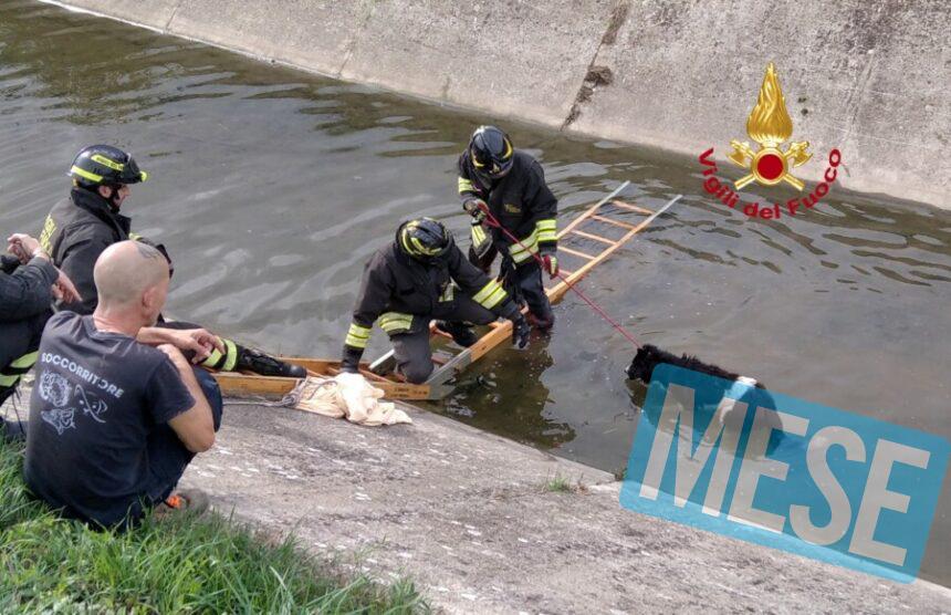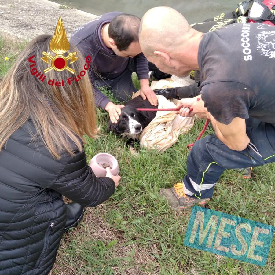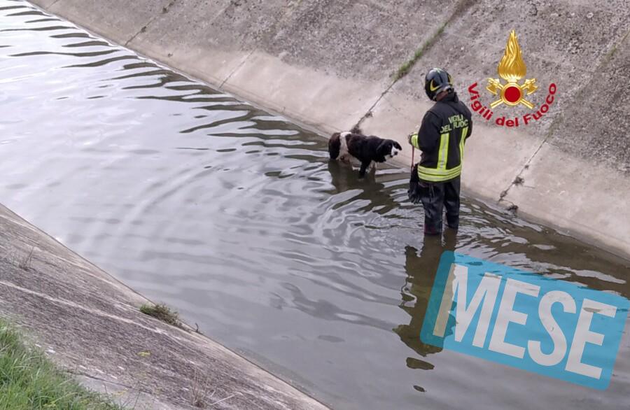 I Vigili del Fuoco, intervenuti con una squadra, sono scesi all’interno del canale e hanno recuperato il cane apparentemente sfinito, con l’acqua che immergeva completamente le zampe.