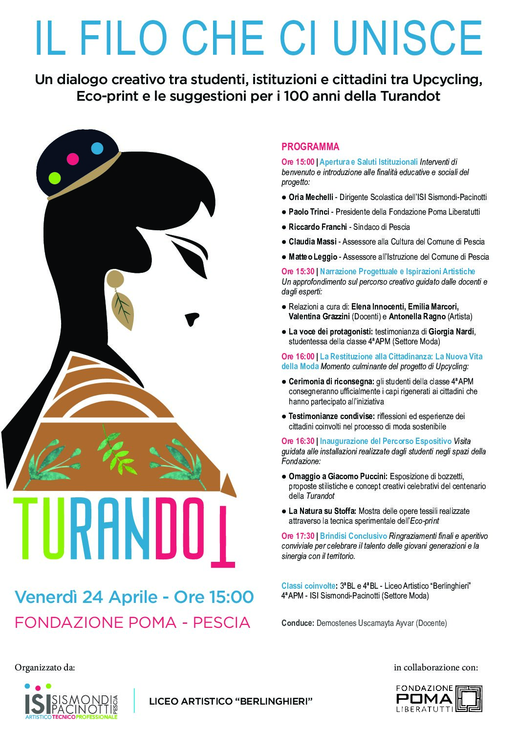 Cosa prevede il pomeriggio del 24 aprile? La Restituzione: Gli studenti riconsegneranno ai legittimi proprietari i capi che sono stati loro affidati nei mesi scorsi, a cui è stata donata una nuova vita grazie all’Upcycling. Un gesto in cui i cittadini sono stati veri complici creativi! La Natura su Stoffa: si disvelerà la magia della natura impressa sui tessuti con l’arte dell’Eco-print. Omaggio a Puccini: I ragazzi del Sismondi-Pacinotti guideranno i presenti in un suggestivo percorso espositivo di bozzetti e concept per celebrare i 100 anni della Turandot. L’ingresso è libero e tutti sono i benvenuti!