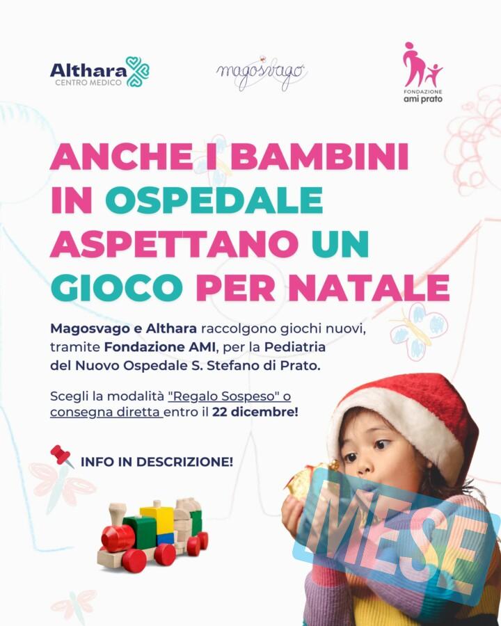 Fare arrivare un sorriso dove serve davvero. E’ l’obiettivo dell’iniziativa promossa da Althara Centro Medico, la struttura sanitaria pratese di via dello Sprone a Grignano. Fino al 22 dicembre, infatti, saranno raccolti giochi nuovi da consegnare poi ai bambini del reparto di pediatria dell’ospedale Santo Stefano. “Un dono – spiegano dal centro medico -, che può trasformare un momento difficile in un Natale pieno di magia”.