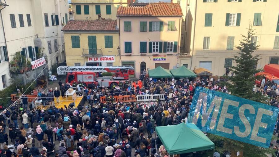 Lucca – Tantissime persone, tantissimi bambini in piazza San Francesco per la Festa della Befana, che da 28 anni anima la città grazie al Comitato popolare di piazza San Francesco con la collaborazione dei Vigili del Fuoco di Lucca, dell’associazione Fermento e della Croce Verde di Lucca, grazie al contributo di Comune di Lucca – Lucca Magico Natale e Fondazione Cassa di Risparmio di Lucca.