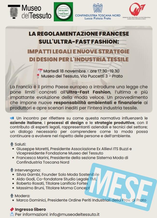 L’iniziativa, dal titolo ‘La regolamentazione francese sull’Ultra Fast Fashion: impatti legati e nuove strategie di design per l’industria tessile’ vuole riflettere su come questa normativa influenzerà le aziende italiane, i processi di design e le strategie produttive, con il contributo di esperti legali, rappresentanti aziendali e tecnici del settore. Un dialogo necessario per comprendere come la moda possa continuare a evolvere nel rispetto delle persone e dell’ambiente.