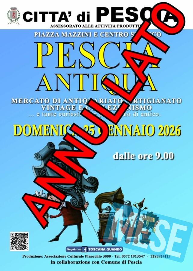 Pescia – L’associazione culturale Pinocchio 3000, d’intesa con l’Assessorato alle attività produttive del Comune di Pescia, viste le avverse previsioni meteo per la giornata di domenica 25 gennaio, comunica l”’annullamento di Pescia Antiqua rinnovando ad espositori e visitatori l’invito per la quarta domenica del prossimo mese di febbraio. Info 0572 1913547