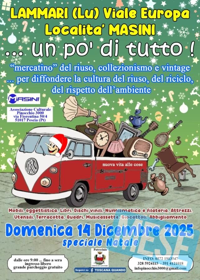 Dopo le ben riuscite edizioni fin qui effettuate, domenica 14 dicembre 2025, dalle 9, torna, a Lammari, sul viale Europa e in località Masini, una nuova edizione di …Un Po’ Di Tutto! il mercatino del riuso, del collezionismo e del vintage che si pone lo scopo di diffondere la cultura del riciclo e, soprattutto, del rispetto dell’ambiente.