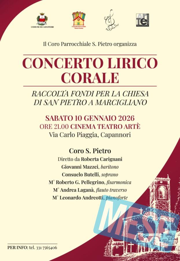 Capannori – Domani, sabato 10 gennaio, alle ore 21.00, al Cinema Teatro Artè è in programma il ‘Concerto Lirico Corale’ del Coro S. Pietro. Il concerto è organizzato dal Coro San Pietro e dalla Comunità Parrocchiale Santa Gemma con il patrocinio del Comune per raccogliere fondi da destinare alla ristrutturazione della chiesa di S. Pietro a Marcigliano.