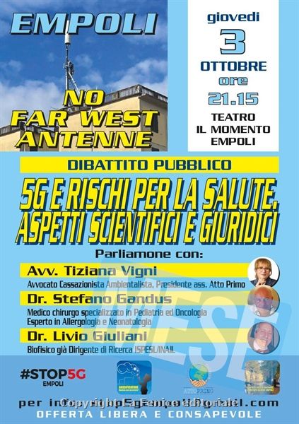 EMPOLI – Nasce un nuovo Comitato sulla questione dell’impatto sanitario del 5G e del costante incremento esponenziale alle onde elettromagnetiche e, considerato che ritiene ci sia molta confusione e disinformazione interessata sul tema, organizza una serata di informazione con esperti. Ci spiega Tiberio tantini, un esponente del Comitato: “Si parla di studi altisonanti dell’OMS quando in realtà l’OMS ha utilizzato un suo ufficio ed un ente privato per fare una ricerchina con quattro soldi molto lacunosa Grazie alla leggerezze con cui sono stati elevati da 6 a 15 V/m misurati sulla media di 24 ore i limiti di attenzione negli ambienti abitativi, di studio e lavorativi, le compagnie telefoniche, tutte in mano di fondi di investimento internazionali, hanno risparmiato in Italia 4 miliardi di euro su impianti ( fibra e Antenne più piccole e numerose) mentre noi vogliamo un incremento delle azioni a tutela della salute”. Su questi temi è stato promosso un dibattito pubblico con l’avvocato Tiziana Vigni, il Dr. Stefano Gandus, medico chirurgo specializzato in allergologia e il Dr. Livio Giuliani, Biofisico, già dirigente di ricerca ISPES/INAIL. Il dibattito si terrà giovedì 3 ottobre ore 21,15 presso il teatro Il Momento, via del Giglio, 59 Empoli.