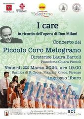FIRENZE – Il prossimo venerdì 22 marzo, con inizio alle ore 19, nella basilica di Santa Croce a Firenze (in piazza Santa Croce) il piccolo coro del Melograno diretto da Laura Bartoli presenterà “I Care”. Una serata dedicata al ricordo dell’opera di Don Milani. L’ingresso all’evento è gratuito.
