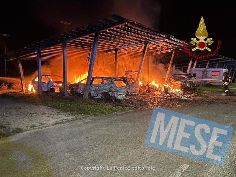 Ad andare a fuoco sono stati 8 auto e un camper che si trovavano sotto una tettoia in acciaio con copertura di pannelli fotovoltaici. I Vigili del Fuoco intervenuti hanno prontamente spento le fiamme e messo in sicurezza la zona. Nessuna persona coinvolta.