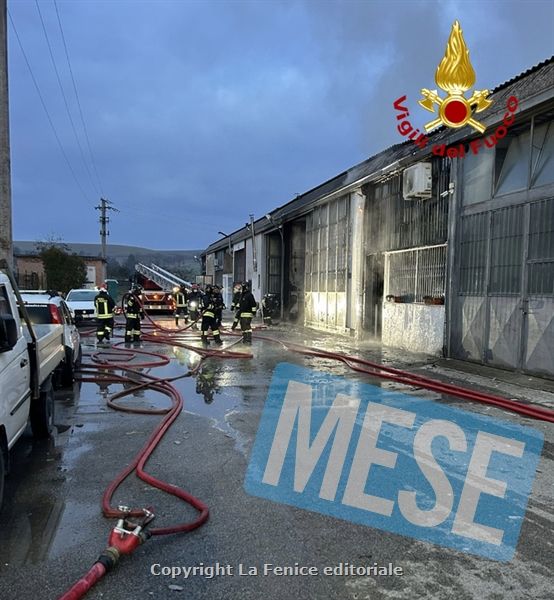 L’incendio ha interessato tre autocarri, bombole di acetilene e altri materiali che si trovavano all’interno, con il tetto della struttura che è collassato.