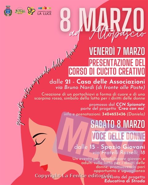 Sabato 8 marzo, dalle 15 allo Spazio Giovani di via Fratelli Rosselli 18, si terrà “Voce delle Donne”, un evento inserito nel progetto “Educativa di Strada – Giovani al Centro”. L’iniziativa vuole sensibilizzare i giovani e la comunità sul tema dei diritti delle donne, offrendo uno spazio libero di discussione sull’uguaglianza, le pari opportunità e l’importanza delle conquiste femminili nel corso della storia. Dopo una prima chiacchierata, l’evento si sposterà nel centro di Altopascio, dove i ragazzi potranno confrontarsi direttamente con i cittadini, facendo loro domande, scambiando pensiero e raccogliendo opinioni, testimonianze e storie legata a ciò che rappresenta oggi la Giornata internazionale dei diritti delle donne.