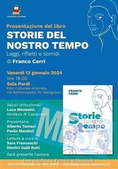 CAPANNORI – E’ stata anticipata alle ore 18.00 la presentazione del libro di Franco Cerri ‘Storie del nostro tempo. Leggi, rifletti e sorridi’ (Edizioni Dottrinari) in programma domani, venerdì 12 gennaio, nella Sala Pardi del Polo Culturale Artèmisia di Tassignano, inizialmente fissata alle 18.30. Alla presentazione interverranno Alberto Tomasi e Paolo Mandoli. In programma letture a cura di Sara Franceschi e Dimitri Galli Rohl. Nel libro di Franco Cerri sono raccolte alcune storie e modi particolari di vivere del nostro tempo, sia nella società civile che nella comunità ecclesiale, con l’invito al lettore ‘di leggere, riflettere e sorridere… nonostante tutto!’. Sarà presente l’autore.