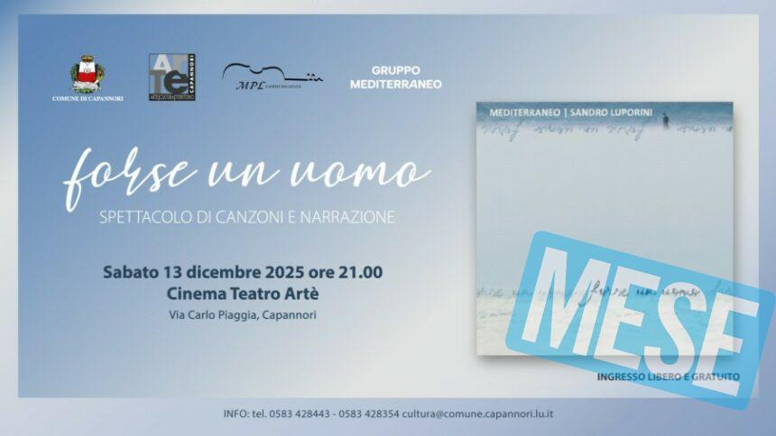 Capannori – C’è attesa per lo spettacolo musicale ‘Forse un uomo’ che si terrà in anteprima assoluta sabato 13 dicembre, alle ore 21.00, al Cinema Teatro Artè di Capannori. ‘Forse un uomo’, spettacolo con testi del grande paroliere versiliese  Sandro Luporini, coautore di tutti gli spettacoli teatrali e delle canzoni più evocative di Gaber e musiche del Gruppo Mediterraneo, vedrà esibirsi Giulio D’Agnello voce e chitarra, Tony Masoni, keyboards, Antonello Solinas, basso elettrico, Diego Guarino, batteria.