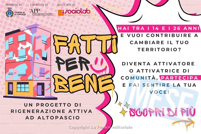 ALTOPASCIO – Rigenerare il territorio attraverso le idee, le visioni e i sogni dei giovani altopascesi. Si chiama “Fatti per Bene” ed è il nuovo progetto pensato e promosso dall’amministrazione D’Ambrosio per offrire ai giovani – fascia dai 14 ai 26 anni – nuove opportunità di socialità e coinvolgimento attivo sul territorio. Realizzato in collaborazione con la cooperativa Sociolab e grazie al finanziamento di APP – Autorità Regionale per la Garanzia e la Promozione della Partecipazione, il progetto punta a rafforzare il legame tra le nuove generazioni e la comunità locale attraverso ascolto, formazione, sperimentazione e una reale mappatura dei bisogni della comunità giovanile, grazie anche alla diffusione di un questionario specifico.