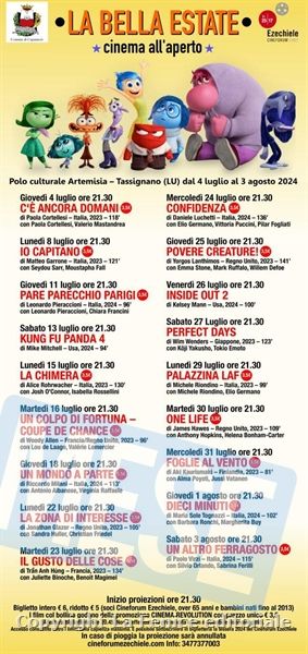 giovedì 4 luglio ‘C’è ancora domani’* di Paola Cortellesi – Italia, 2023 – 118′ con Paola Cortellesi, Valerio Mastandrea; lunedì 8 luglio ‘Io Capitano’* di Matteo Garrone – Italia, 2023 – 121′ con Seydou Sarr, Moustapha Fall; giovedì 11 luglio ‘Pare parecchio Parigi’* di Leonardo Pieraccioni – Italia, 2024 – 96′ con Leonardo Pieraccioni, Chiara Francini; sabato 13 luglio ‘Kung Fu Panda 4’ di Mike Mitchell – Usa, 2024 – 94′; lunedì 15 luglio ‘La chimera’* di Alice Rohrwacher – Italia, 2023 – 130′ con Josh O’Connor, Isabella Rossellini; martedì 16 luglio* ‘Un colpo di fortuna- Coupe de chance’* di Woody Allen – Francia/Regno Unito, 2023 – 96′ con Lou de Laage, Valérie Lemercier; giovedì 18 luglio ‘Un mondo a parte’* di Riccardo Milani -Italia, 2024 – 113′ con Antonio Albanese, Virginia Raffaele; lunedì 22 Luglio ore 21.30 ‘La zona di interesse’* di Jonathan Glazer – Regno Unito, 2023 – 105’ con Sandra Huller, Christian Friedel; martedì 23 luglio ’Il gusto delle cose’* di Trần Anh Hùng – Francia, 2023 – 134′ con Juliette Binoche, Benoit Magimel; mercoledì 24 luglio ‘Confidenza’ * di Daniele Lucchetti – Italia, 2024 – 136′ con Elio Germano, Vittoria Puccini, Pilar Fogliati; giovedì 25 luglio ‘Povere creature!’* di Yorgos Lanthimos – Regno Unito, 2023 – 141’ con Emma Stone, Mark Ruffalo, Willem Defoe; venerdì 26 luglio ‘Inside Out 2’ di Kelsey Mann – Usa, 2024 – 100′; sabato 27 luglio ‘Perfect days’ di Wim Wenders – Giappone, 2023 – 123′ con Kôji Yakusho, Tokio Emoto; lunedì 29 luglio ‘Palazzina Laf’* di Michele Riondino – Italia, 2023 – 99′ con Michele Riondino, Elio Germano; martedì 30 luglio ‘One Life’* di James Hawes – Regno Unito, 2023 – 109′ con Anthony Hopkins, Helena Bonham-Carter; mercoledì 31 luglio ‘Foglie al vento’* di Aki Kaurismaki – Finlandia, 2023 – 81′ con Alma Poysti, Jussi Vatanen; giovedì 1 agosto ‘Dieci minuti’* di Maria Sole Tognazzi – Italia, 2024 – 102′ con Barbara Ronchi, Margherita Buy; sabato 3 agosto ‘Un altro ferragosto’* di Paolo Virzì – Italia, 2024 – 115′ con Silvio Orlando, Sabrina Ferilli.