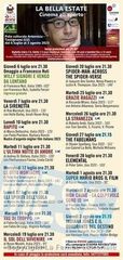 Giovedì 6 luglio ore 21.30 Omaggio a Francesco Nuti ‘Willy Signori e vengo da lontano’ di Francesco Nuti (Italia 1989 – 102′) con Francesco Nuti, Isabella Ferrari, Alessandro Haber, Novello Novelli – Ingresso gratuito; venerdì 7 luglio ore 21.30 ‘La Sirenetta’ di Rob Marshall (Usa 2023 – 135′ ) con Halle Bailey, Jonah Hauer-King; lunedì 10 luglio ore 21.30 ‘Rapito’ di Marco Bellocchio (Italia 2023 – 125′) con Paolo Pierobon, Barbara Ronchi **- Nastro d’argento come miglior film italiano 2023; martedì 11 luglio ore 21.30 ‘L’ultima notte di amore’ di Andrea Di Stefano (Italia 2023 – 120′) con Pierfrancesco Favino, Linda Caridi **; mercoledì 12 luglio ore 21.30 ‘Le otto montagne’ (Italia 2023 – 145′) di Felix Van Groeningen e Charlotte Vandermeersch con Luca Marinelli, Alessandro Borghi ** ; lunedì 17 luglio ore 21.30 ‘Gli spiriti dell’isola’ di Martin Mc Donagh, Usa/Irlanda 2022 – 114′ con Colin Farrell, Brendan Gleeson; martedì 18 luglio ore 21.30 ‘Tre di troppo’ di Fabio De Luigi, (Italia 2023 – 107 ) con Fabio De Luigi, Virginia Raffaele**; mercoledì 19 luglio ore 21.30 ‘Il sol dell’avvenire’ di Nanni Moretti (Italia 2023 – 95′) con Nanni Moretti, Silvio Orlando, Margherita Buy **; giovedì 20 luglio ore 21.30 Spider-Man: Across The Spider-Verse (Usa 2023 – 140′) di Joaquim Dos Santos, Kemp Powers e Justin K. Thompson; martedì 25 luglio ore 21.30 ‘Grazie Ragazzi’ di Riccardo Milani, (Italia 2023 – 117′) con Antonio Albanese, Sonia Bergamasco **; mercoledì 26 luglio ore 21.30 ‘La stranezza’ di Roberto Andò (Italia 2022 – 103′) con Toni Servillo, Salvatore Ficarra, Valentino Picone **; giovedì 27 luglio ore 21.15 ‘The Fabelmans’ di Steven Spielberg (Usa 2022 – 151′) con Gabriel La Belle, Michelle Williams, Paul Dano; venerdì 28 luglio ore 21.30 ‘Elemental’ di Peter Sohn, (Usa 2022 – 103′); martedì 1 agosto ore 21.30 ‘Super Mario Bros’ Il film di Aaron Horvath (Usa 2023 – 92′); mercoledì 2 agosto ore 21.30 ‘Mon Crime- La colpevole sono io’ di François Ozon, (Francia 2023 – 102′) con Nadia Tereszkiewicz, Rebecca Marder, Isabelle Huppert **; giovedì 3 agosto ore 21.15 ‘Indiana Jones e il quadrante del destino’ di James Mangold (Usa 2023 – 154′) con Harrison Ford, Phoebe Waller-Bridg.
