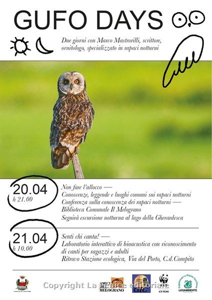 CAPANNORI – Domani, sabato 20 aprile, e domenica 21 aprile il Comune di Capannori in collaborazione con Legambiente Capannori e Piana lucchese, WWF Alta Toscana, Gruppo Italiano Civette e associazione Amici del Melograno, organizza l’iniziativa ‘Gufo days’, due giornate speciali realizzate nell’ambito del progetto di valorizzazione del lago della Gherardesca, con la presenza del noto ornitologo Marco Mastrorilli, esperto internazionale di rapaci notturni, scrittore, divulgatore, presente in molte trasmissioni televisive.