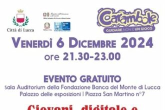 9 e 10 dicembre, ore 14.00-17.30 Sede Misericordia di Santa Gemma, via Stradone di Camigliano 47-51, Camigliano; In volo con Babbo Natale, 9 e 10 dicembre , ore 9.30-16.30 Aeroporto, Tassignano (In caso di pioggia, si svolgerà il 16 e 17 dicembre); C’era una volta 13 e 20 dicembre, ore 17.00, Centro per le famiglie Piccola Artemisia, via Guido Rossa, Capannori; Natale a Capannori 16 dicembre (ore 9.00 – 18.00) e 17 dicembre (ore 8.00 – 20.00), Capannori centro; Christmas Party ,17 dicembre, ore 15.30-20.00 Sede associazione Fonte del Sorriso, via del Molino, 17, Castelvecchio di Compito; Carte (di Natale) d’Artista, 19 dicembre, ore 17.00, Centro per le famiglie Piccola Artemisia, via Guido Rossa, Capannori; Biblioteca itinerante in natura, 22 dicembre ore 16.30 Centro per le famiglie Piccola Artemisia, via Guido Rossa, Capannori; Babbo Natale a Casa Gori, 24 dicembre ore 17.30 Rsa “Don. A. Gori”, Marlia; Canto delle Pastorelle, 26 dicembre, ore 16.00 Rsa “Don. A. Gori”, Marlia.