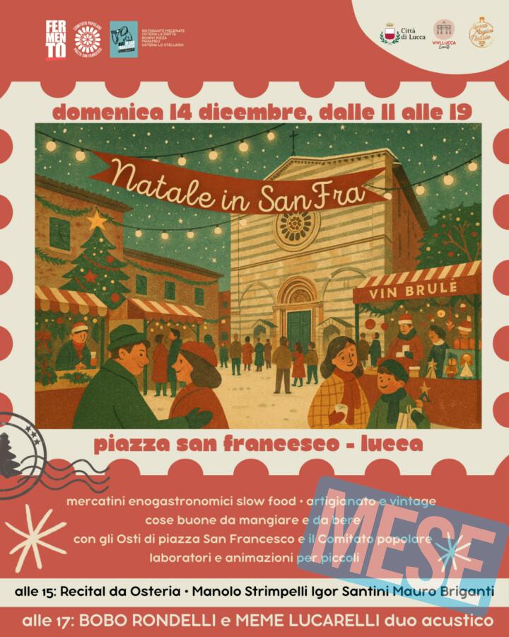 LUCCA – Domenica 14 dicembre piazza San Francesco si veste a festa con Natale in SanFra, una giornata comunità e aggregazione, festa e divertimento che unisce mercatini, musica dal vivo, buon cibo, proposte artigianali e animazioni per i più piccoli in una delle piazze più belle del centro storico. Un evento pensato per tutte le età, come momento di incontro e condivisione, tradizione e cultura popolare, capace di valorizzare il tessuto sociale e artistico del quartiere e della città.