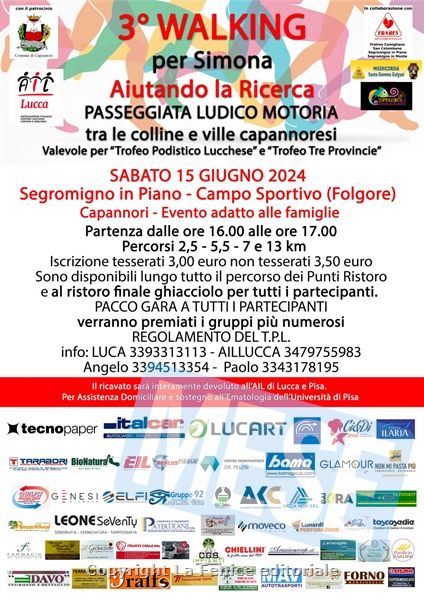 CAPANNORI – Sabato 15 giugno si terrà la ‘3a Walking per Simona – aiutando la ricerca’, una passeggiata ludico motoria tra le colline e le ville capannoresi, organizzata dall’AIL (Associazione Italiana contro leucemie, linfomi e mieloma) Lucca in collaborazione con i Donatori di Sangue Fratres di Camigliano, San Colombano, Segromigno in Piano e Segromigno in Monte, la Misericordia Santa Gemma Galgani di Camigliano e il patrocinio del Comune di Capannori. L’evento, adatto alle famiglie, è valevole per il “Trofeo Podistico Lucchese” e il ‘Trofeo Tre Province’. La partenza è prevista dalle ore 16 alle ore 17 dal Campo Sportivo (Folgore) di Segromigno in Piano. Quattro i percorsi in programma: 2,5 km; 5,5 km; 7 km e 13 km.