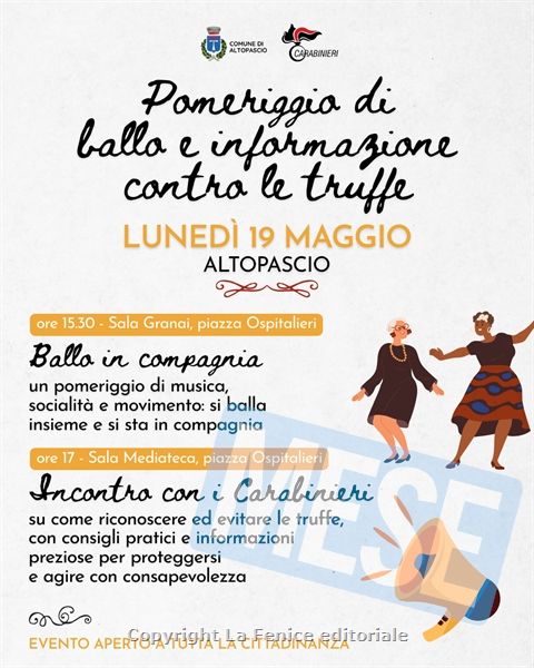 Altopascio – Unire il piacere dello stare insieme all’importanza della conoscenza: questo l’obiettivo del pomeriggio di ballo e informazione contro le truffe, in programma lunedì 19 maggio ad Altopascio, organizzato dal Comune insieme ai Carabinieri.