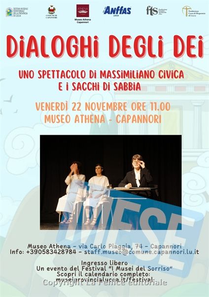 CAPANNORI- Venerdì 22 novembre alle ore 11.00 al Museo Athena di via Carlo Piaggia a Capannori sarà messo in scena lo spettacolo ’Dialoghi degli dei’ da Luciano di Samosata di Massimiliano Civica e ‘I Sacchi di Sabbia’ (produzione Compagnia Lombardi-Tiezzi). Lo spettacolo fa parte della rassegna denominata “I musei del sorriso” promossa dal Sistema Museale della Provincia di Lucca con la collaborazione del Comune, a cura di Fondazione Toscana Spettacolo e con il sostegno della Fondazione Cassa di Risparmio di Lucca.