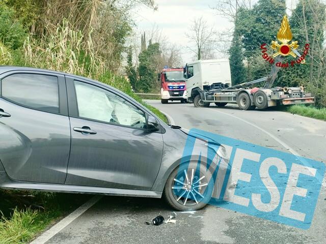 Pisa – Squadra dei Vigili del Fuoco di Pisa è intervenuta alle ore 12.08 in Via del Commercio Comune di Lari per incidente stradale. La motrice di un camion ed una autovettura si sono scontrati frontalmente. La vettura dopo l’impatto è stata sbalzata fuori strada. Il personale VVF ha collaborato con il 118 per far uscire dall’ abitacolo la conducente dell’auto. La ragazza lievemente ferita è stata trasportata al vicino Ospedale Lotti di Pontedera per accertamenti. Si provvedeva alla messa in sicurezza dell’auto ibrida. Entrambe le corsie chiuse fino alla rimozione del camion. Sul posto VVUU di Casciana T. Lari, 118.