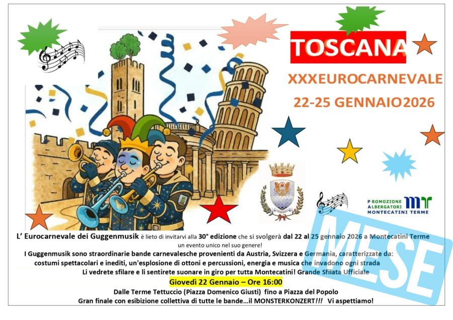 Giovedì 22 gennaio sarà possibile conoscere e apprezzare a Montecatini Terme – e per la prima volta in Toscana – tutta la suggestione della Guggenmusik, suonata da straordinarie bande carnevalesche provenienti da Germania, Austria e Svizzera.