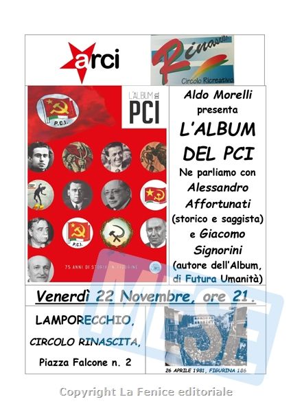 LAMPORECCHIO – Il prossimo venerdì 22 novembre, con inizio alle 21, nei locali del circolo Rinascita di Lamporecchio, c’è un appuntamento imperdibile per i nostalgici del partito comunista e per gli amanti della storia. L’ex sindaco di Lamporecchio Aldo Morelli presenterà “L’album del PCI”. Il dibattito sull’album, il cui autore Giacomo Signorini (di Futura Umanità) sarà presente all’evento, sarà moderato e condotto dallo storico e saggista Alessandro Affortunati. L’opera raccoglie, con il formato di un album di figurine (ce ne sono ben duecentotrentuno) e una comunicazione semplice e diretta, immagini e informazioni sulla storia del PCI dalla fondazione a Livorno nel 1921 allo scioglimento nel congresso del 1991. Uno spaccato delle vicende del partito ma non solo, anche una chiave di lettura della storia politica contemporanea attraverso gli accadimenti di uno dei più importanti partiti politici del dopoguerra.