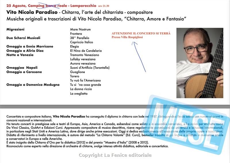 Protagonista della serata sarà il celebre chitarrista e compositore Vito Nicola Paradiso, che presenterà il suo programma “Chitarra, Amore e Fantasia”, un affascinante viaggio musicale tra composizioni originali e trascrizioni di grande suggestione.