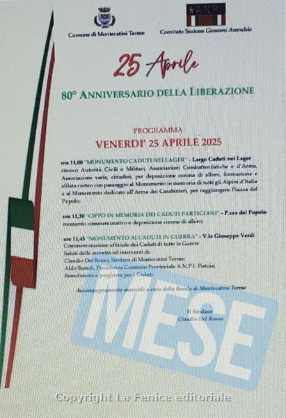 MONTECATINI TERME – Venerdì 25 aprile p.v. a Montecatini Terme, si terrà la cerimonia per ricordare l’Anniversario della Liberazione Nazionale come da programma di seguito indicato