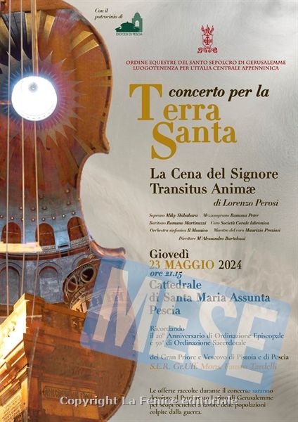 PESCIA – Si terrà giovedì 23 alle ore 21 in Cattedrale a Pescia il concerto di musica sacra organizzato dalla Luogotenenza dell’Italia centrale appenninica dell’Ordine Equestre del Santo Sepolcro di Gerusalemme con il patrocinio della Diocesi di Pescia. La rassegna musicale è pensata per offrire a tutti i partecipanti una serata bella e interessante con l’obiettivo di aiutare il Patriarcato Latino di Gerusalemme raccogliendo offerte per il sostentamento delle opere che realizza in Terra Santa e soprattutto le popolazioni colpite dalla guerra in corso.