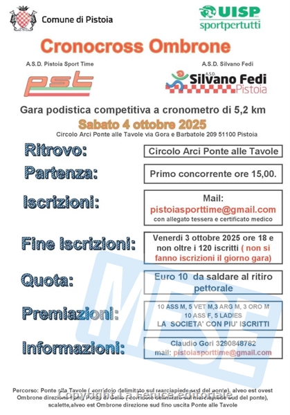 PISTOIA – L’Asd Pistoia Time e la Silvano Fedi Pistoia, con il patrocinio del Comune di Pistoia organizzano sabato 4 ottobre a Ponte alle Tavole (Pistoia) una gara podistica competitiva a cronometro sulla distanza di km 5,200, denominata ‘’Cronocross Ombrone’’.