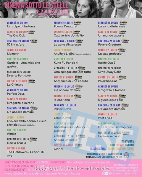 PISTOIA – Torna ad aprirsi il sipario sul cinema estivo. Prevista per venerdì 21 giugno la prima proiezione nello spazio dell’arena di Porta al Borgo, in via delle Pentole 4. Il programma, che continuerà fino a settembre, è a cura di Mabuse Cinema in collaborazione con il Comune di Pistoia. La rassegna cinematografica rientra nel ricco calendario Pistoia Estate in città 2024.
