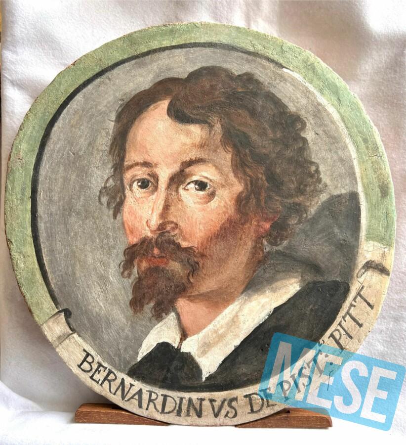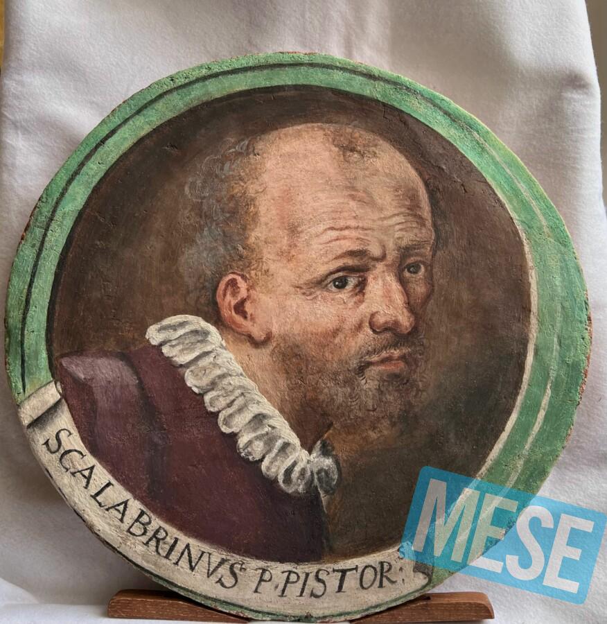 Le due opere, di forma circolare, raffigurano, come riportato nelle iscrizioni presenti lungo i bordi, lo Scalabrino e Bernardino da Pistoia, ovvero Giovan Battista Volponi e quasi sicuramente Bernardino Detti, pittori pistoiesi attivi nella prima metà del Cinquecento e poco oltre, dei quali il Museo Civico d’arte antica espone due tavole emblematiche del loro percorso artistico, temporaneamente collocate nel mezzanino a fianco dei due ritratti: di Giovanni Battista Volponi detto Lo Scalabrino la Sacra Conversazione con i Santi Agata, Jacopo, Zeno ed Eulalia (1525 circa), proveniente dalla cappella di Sant’Agata del Palazzo di Giano; di Bernardino Detti la Sacra Conversazione con la Vergine in Umiltà e i Santi Bartolomeo, Jacopo e Giovannino detta la Madonna della Pergola (1523), proveniente dall’oratorio di San Jacopo alla Pergola.