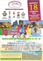 PISTOIA – Domenica 18 febbraio a Molin Nuovo di Chiesina Uzzanese (Pistoia )si disputerà la gara podistica denominata ”10° Cinque Comuni- Memorial Francesco Magrini” sulle varie distanze di km 3-6-12-18 a carattere ludico motorio su di un percorso misto pianura+ collina e organizzata dal Gruppo Podistico Ponte Buggianese Molin Nuovo. Il ritrovo e le partenze sono fissate dalle ore 8 alle ore 9 con partenza libera dal Circolo RCS Molin Nuovo. La quota iscrizione alla gara è fissata in euro 3 per i tesserati società e euro 3,50 per i singoli, pacco gara per tutti i partecipanti esclusi quelli che si iscriveranno a euro 1,50.La manifestazione e valida come ”Trofeo Podistico Lucchese e ”Trofeo Podistico Pisano” per l’anno 2024.Premi atutte le società con coppe,targhe e premi in natura fino ad esaurimento.Per informazioni sulla gara telefonare al numero di cellulare 3703058001.