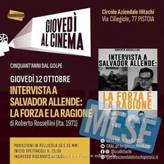 PISTOIA – Il secondo appuntamento della stagione di “Giovedì al cinema” aprirà la mini rassegna “Cinquant’anni dal Golpe”, dedicata all’anniversario della drammatica crisi cilena del 1973: in proiezione giovedì 12 ottobre nel salone auditorium del Circolo Aziendale Hitachi “Intervista a Salvador Allende: la forza e la ragione” di Roberto Rossellini, audiovisivo realizzato nel maggio 1971 a Santiago nella residenza del neopresidente cileno. Si tratta di una conversazione considerata un documento prezioso, nel quale il regista di “Roma città aperta” diventa cronista appassionato di fronte all’uomo che voleva cambiare la storia del suo Paese attraverso una nuova via al socialismo e che due anni dopo sarà deposto nel golpe che porterà all’instaurazione della dittatura Pinochet nel Paese sudamericano. La rassegna dedicata al Cile proseguirà poi giovedì 19 con “Codice 2015. Valparaiso non risponde”.