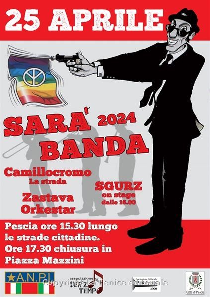 Nel pomeriggio, a partire dalle ore 15, lungo le strade cittadine, per iniziativa dell’ANPI e dell’associazione Terzo tempo, ci sarà SARA’ BANDA, una grande animazione musicale in movimento, con la partecipazione del gruppo Camillocromo, della Zastava Orkestar e degli Sgurz per terminare poi, tutti insieme in concerto, intorno alle ore 17,30 sul palco collocato in piazza Mazzini.