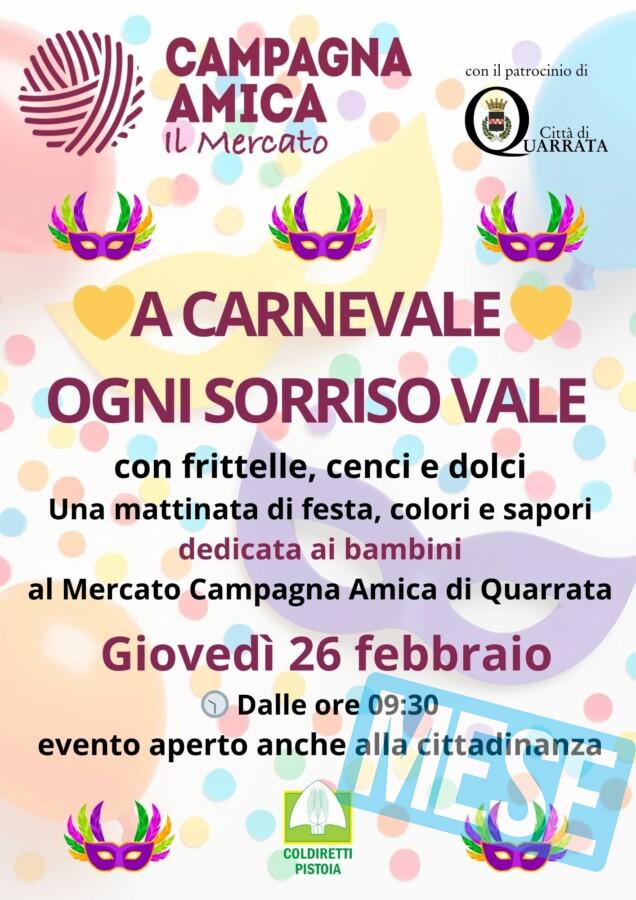 Quarrata – Giovedì 26 febbraio, il Mercato di Campagna Amica di Quarrata si trasformerà in un luogo di festa, colori e profumi per celebrare il Carnevale con una mattinata dedicata ai bambini e alla comunità. A partire dalle ore 9:30, i bambini delle scuole dell’infanzia Bruno Munari’ dell’Istituto Comprensivo Statale Bonaccorso da Montemagno di Quarrata parteciperanno a un’iniziativa pensata per unire allegria, tradizione e attenzione al cibo buono e genuino. Una festa rimandata per due volte a causa del maltempo.
