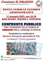 Il Comitato “IL PALAGIO”, nato per stimolare la riqualificazione del Centro storico della Città di Pescia, nell’ambito delle sue iniziative ha organizzato un confronto pubblico tra tutti i candidati alla carica di Sindaco per giovedì 11 maggio 2023, alle ore 18.30, presso il BAR SPORT, in Piazza S.Stefano.