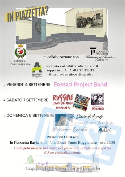 PONTE BUGGIANESE – Si tratta di una serie di eventi che avranno luogo il 6, 7 e 8 settembre 2024 in Piazza Ilaria Alpi, nel centro storico di Ponte Buggianese alle ore 21:00. L’Amministrazione promuove così il recupero di uno spazio che è stato restituito ai cittadini utilizzando un’area che una volta ospitava un piccolo teatro ed era stata a lungo inedificata e trascurata, occupata da ruderi proprio in un luogo lungo fiume fra i più caratteristici del paese.