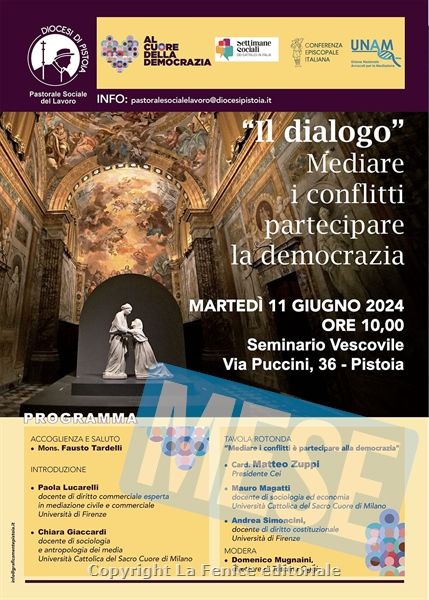PISTOIA – Si terrà il prossimo 11 giugno alle ore 10.00 al Seminario Vescovile di Pistoia, in via Puccini 36, l’incontro “Mediare i conflitti è partecipare alla democrazia”, momento di confronto – organizzato dalla Diocesi di Pistoia in collaborazione con UNAM Associazione Nazionale Avvocati per la Mediazione ed il sostegno di Coldiretti Campagna Amica Pistoia – che vedrà la partecipazione del Presidente CEI, Cardinale Matteo Zuppi, del Vescovo di Pistoia e Pescia, Mons. Fausto Tardelli in dialogo con esperti del mondo accademico.