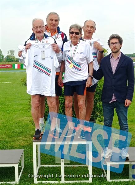I tre titoli tricolori sono stati conquistati con merito dalla staffetta 4×400 metri M75 formata dal quasi 90enne (li festeggerà il prossimo 30 settembre) Remo Marchioni, fenomeno di longevità e classe, e dai bravissimi Mauro Giuntini, Marco Feroci ed Edoardo Scarpetta, dalle talentuose Gioia Ferrari e Francesca D’Annibale, rispettivamente nell’Eptathlon M50 ed Eptathlon M45.