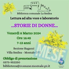 MONTALE – In occasione della Festa della Donna la Biblioteca comunale La Smilea di Montale propone letture ad alta voce con laboratorio rivolte alla fascia d’età che va dai 7 ai 13 anni dal titolo Storie di donne L’appuntamento è per venerdì 8 Marzo 2024, ore 16:45, presso la Sezione Ragazzi della Biblioteca, Villa Smilea – Montale(PT).