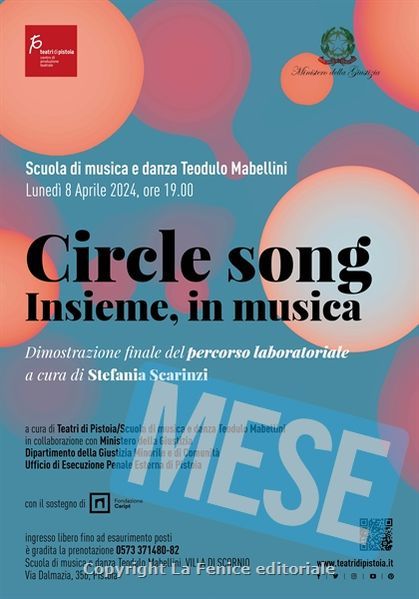 PISTOIA – Lunedì 8 aprile, alle ore 19.00. presso la Scuola di Musica e Danza Teodulo Mabellini va in scena Circle Song –Insieme in musica, dimostrazione finale del laboratorio a cura di Stefania Scarinzi, che dal gennaio scorso ha visto impegnato un gruppo di allievi composto anche da persone in carico