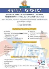 Si può contribuire alla raccolta donando materiale necessario per la scuola per l’infanzia (zainetti, risme di carta A4 bianca non riciclata, raccoglitori ad anelli, porta listini, quaderni A4 a quadri di 1 centimetro, astucci, forbici con punta arrotondata, colla stick, matite, temperini e gomme, buste A4 trasparenti), per la scuola primaria (zaini, quaderni a quadretti e a righe, forbici, colla, righelli, temperini, gomme e lapis, album bianchi da disegno, matite colorate, pennarelli, tempere o acquarelli), e per la scuola secondaria (fogli mobili a quadretti di 4 mm o a righe, evidenziatori, penne, compassi, righe e squadre).