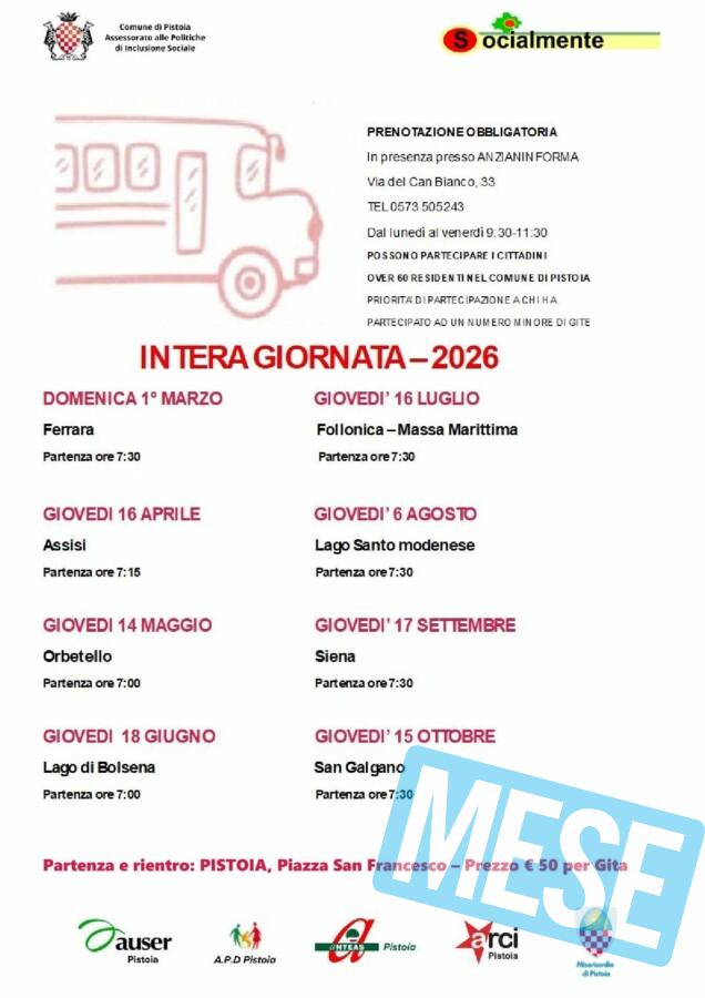 Gite di mezza giornata e gite giornaliere del progetto “Socialmente” sono rivolti ai cittadini over 60 residenti a Pistoia. Il progetto è a cura del Comune di Pistoia e delle associazioni AUSER Territoriale Pistoia, A.N.T.E.A.S. Pistoia, Arciconfraternita Misericordia Pistoia, A.P.D. Pistoia APS e A.R.C.I. Comitato Provinciale di Pistoia.