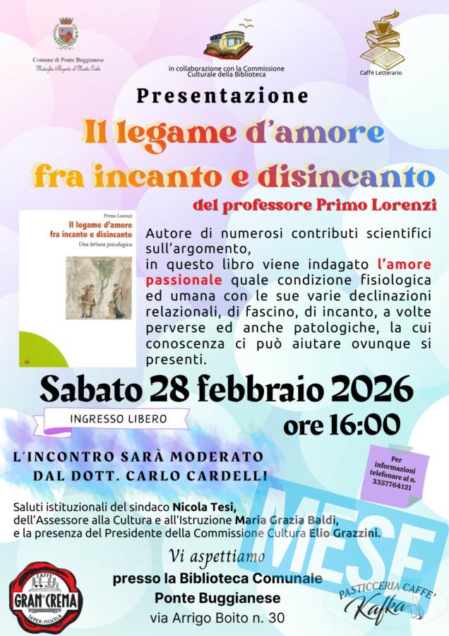 Ponte Buggianese – L’Amministrazione Comunale di Ponte Buggianese, in collaborazione con la Commissione Cultura, organizza per sabato 28 febbraio 2026 alle ore 16:00  presso la Biblioteca Comunale di Via Boito n. 30 a Ponte Buggianese, la presentazione del libro “ Il legame d’amore fra incanto e disincanto” di Primo Lorenzi.