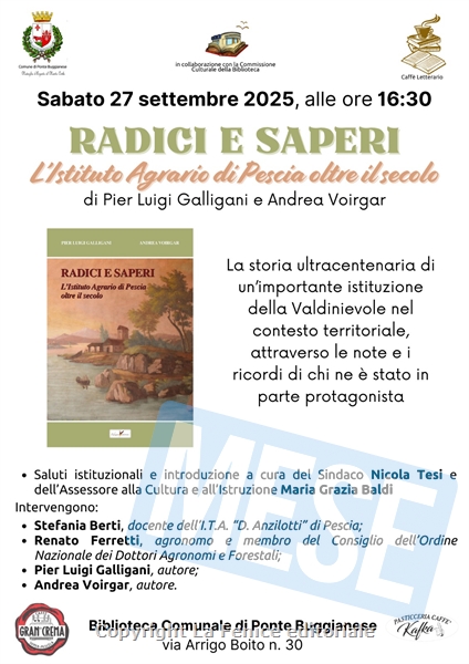 PONTE BUGGIANESE – L’Amministrazione Comunale di Ponte Buggianese, in collaborazione con la Commissione Cultura organizza per sabato 27 settembre 2025 alle ore 16,30 presso la Biblioteca Comunale, la presentazione del libro “RADICI E SAPERI – L’Istituto Agrario di Pescia oltre il secolo” di Pier Luigi Galligani e Andrea Voirgar.