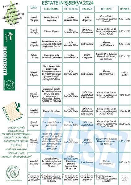 Sei gli eventi principali inseriti in calendario: “notte bianca della biodiversità” domenica 06 agosto presso la Riserva di Abetone, in collaborazione con il Gruppo Astrofili Montagna Pistoiese per osservare e conoscere la volta celeste, e sabato 21 settembre presso la Riserva di Acquerino per ascoltare il bramito del cervo; venerdì 2 agosto “Escursione in musica” nella Riserva di Abetone, per il centenario della morte di Giacomo Puccini, in collaborazione con il Centro Storico Culturale Abetone; venerdì 16 agosto escursione alla Riserva Naturale Orientata di Campolino, area a cui si può accedere solo accompagnati dai Carabinieri Forestali del Reparto Biodiversità di Pistoia, nella quale è conservato il nucleo relitto di abete rosso più meridionale d’Italia, in collaborazione con l’Istituto di Bioscienze e Biorisorse del CNR di Firenze; “A caccia di nuvole”, venerdì 9 agosto, escursione alla scoperta degli effetti dei cambiamenti climatici sugli habitat di alta montagna in collaborazione con il dott. Giulio Betti, meteorologo del Consorzio LaMMA, e l’ormai tradizionale appuntamento con “A piedi all’Orto” (mercoledì 21 agosto), escursione nella Riserva di Abetone che ci porterà fino all’Orto Botanico Forestale dove si svolgerà la visita guidata a cura dell’Associazione Ecomuseo Montagna Pistoiese.