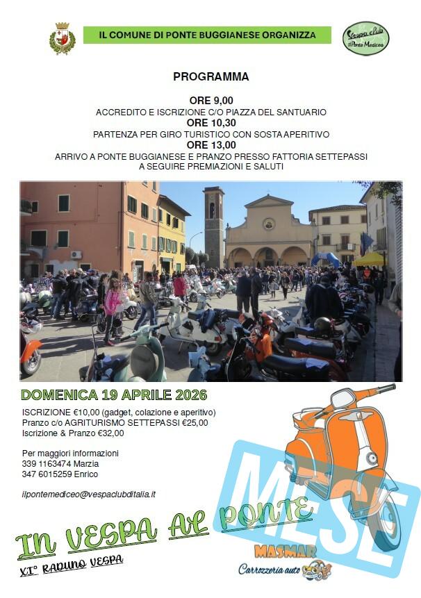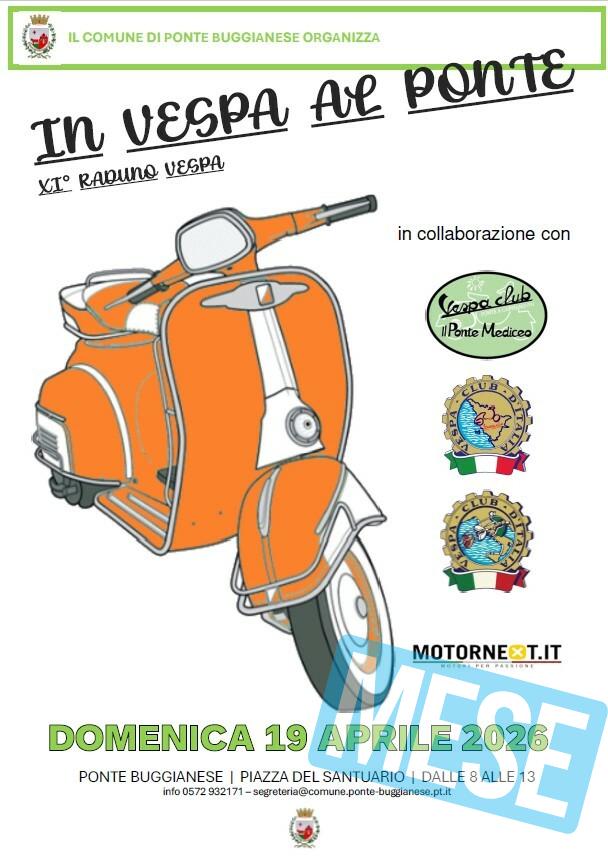 Ponte Buggianese – Domenica 19 Aprile 2026 il Comune di Ponte Buggianese, in collaborazione con il Vespa Club il Ponte Mediceo organizza la 11° edizione del raduno regionale “In vespa al Ponte”.